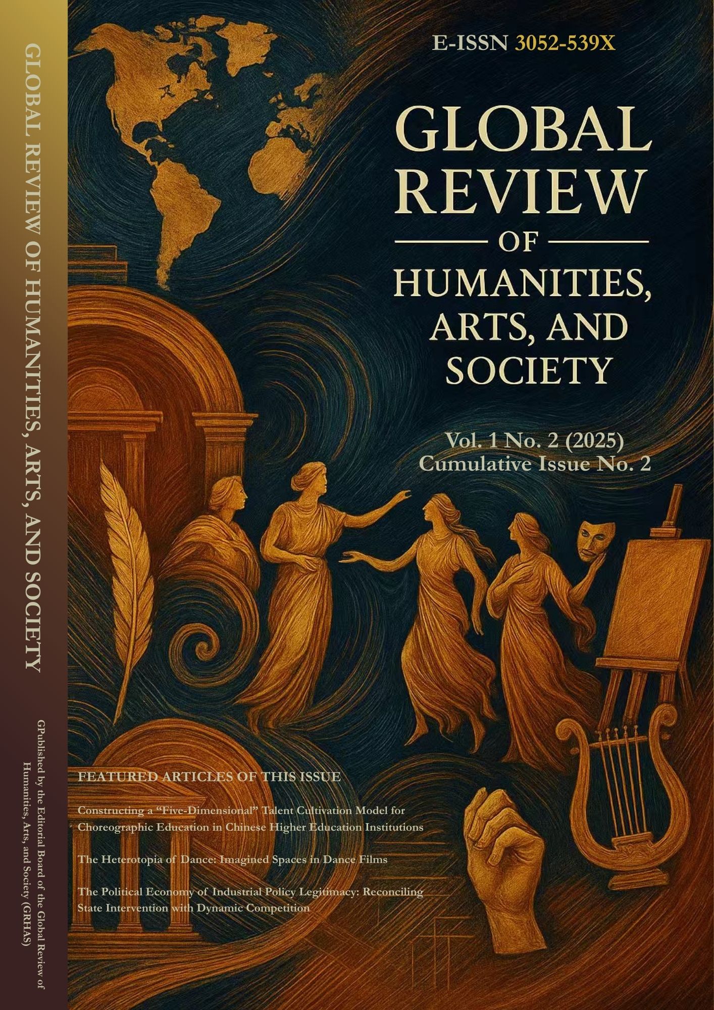 Vol. 1 No. 2 (2025)This issue of the Global Review of Humanities, Arts, and Society brings together cross-regional and cross-disciplinary insights into how individuals and institutions respond to cultural, emotional, and political flux. It features conceptual exploration of industrial policy legitimacy and dynamic state-market relationships; heterotopian space in dance cinema; and the symbolic reconstruction of authoritarian regimes in post-revolution Tunisia. Alongside these are human-centered inquiries into play-based parenting, tarot as urban self-reflection, and the spiritual revival among Asian youth. Across sectors—from public governance to private imagination—our contributors shed light on how new forms of order, resistance, and meaning are imagined and lived.